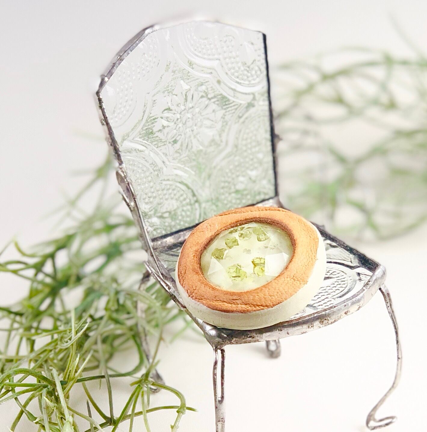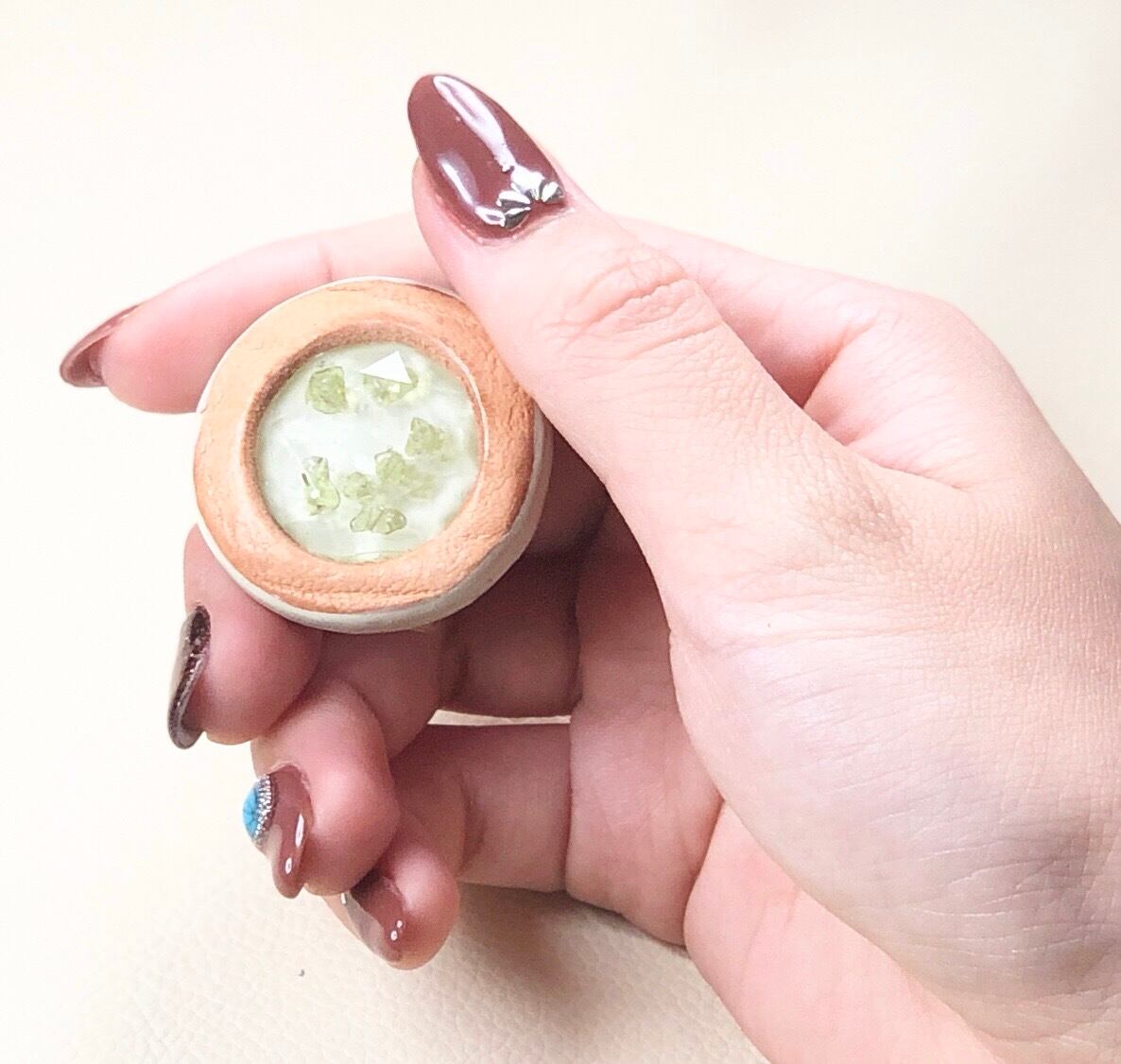 真ん中には、札幌の景観色と樹脂を使いペリドットを閉じ込めました。
