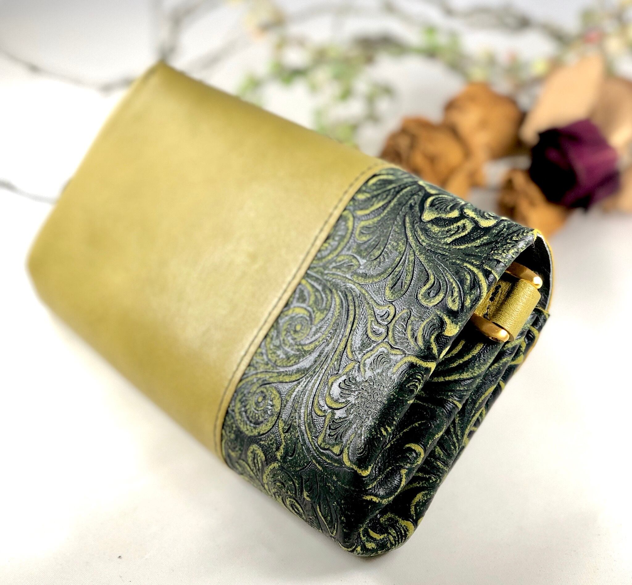 花柄の型押しの革をピスタチオカラーの革に
